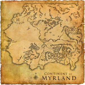 Next is a map of Myrland which was presumably created after the above map of Nave, and is slightly closer to the finalized continent in Mortal Online and Mortal Online 2, now being disconnected from Urmothâr. Many aspects are still quite far off, however, especially with regard to town and city placements.