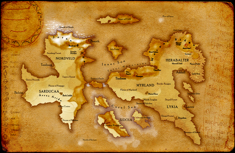 The first example of this category is an early map of Nave depicting the continents in an alternative post-Sundering configuration where, for example, Urmothâr found itself still-connected to Myrland. The map lists many locales which may still be canonical, though many no longer exist in the setting, have moved, been renamed, or have undergone other changes prior to the layout of the continents having been finalized.